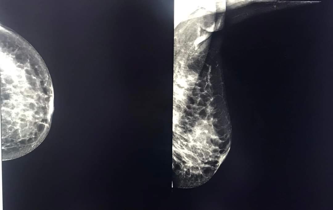 اشعة مامو كرام (Mammogram)للثدي الايمن والايسر Right,Left) (AP,Lateral)) لفتاة تشكو من الم و ورمه وزيادة في حجم الثدي (Fibroadenosis) تبين وجود ورم حميدو تليف الثدي ولا تحتاج لعمليه جراحيه